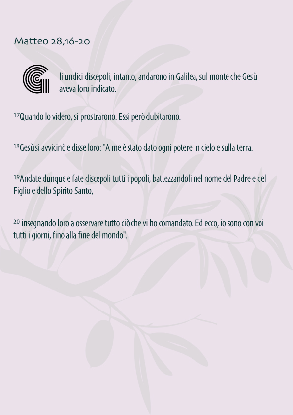 Al Cristo è stato dato ogni potere in cielo e in terra. Gli undici ricevono un comando stringente: “Andate, insegnate a tutte le nazioni, battezzandole nel nome del Padre e del Figlio e dello Spirito Santo” (Mt 28, 19).