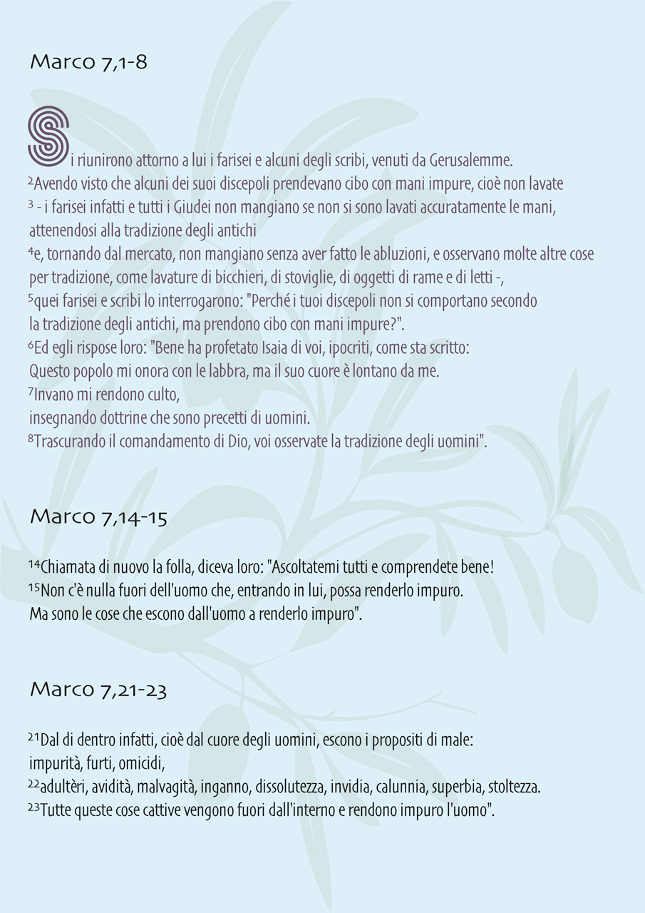 Ciò che rende le mani immonde – tanto da non poter toccare cibo (o Parola) senza prima lavarsi – non è la sporcizia che viene dalla realtà esterna, ma l’impulso malevolo che attraversa le nostre menti. Gesù opera un cambiamento di prospettiva, dando un senso morale e non solo rituale alla purezza: la condotta morale che si adegua al rito testimonia saggezza e sincerità, mentre la vuota e meccanica ripetizione di atti religiosi è solo ipocrisia, inganno.