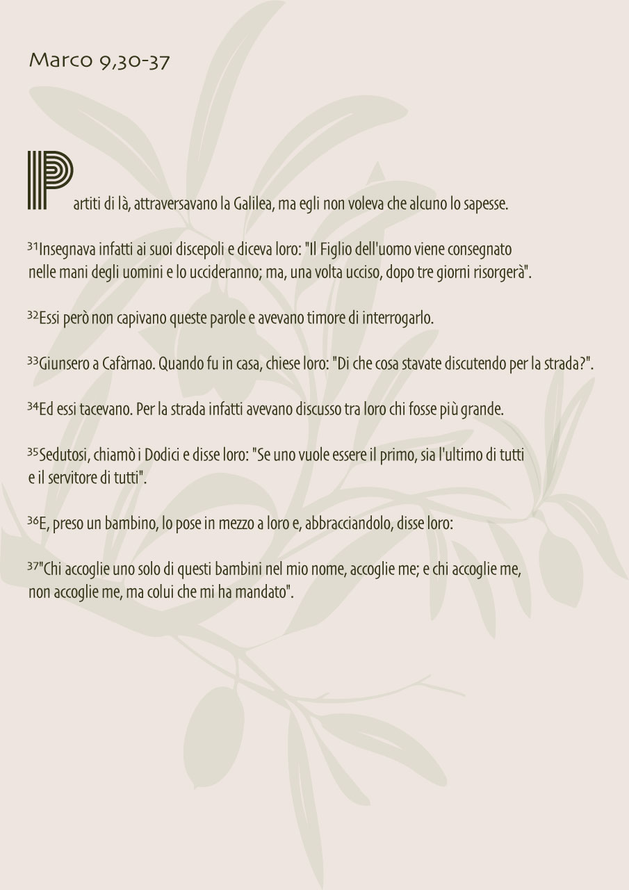 “Il Figlio dell’uomo sta per esser consegnato nelle mani degli uomini e lo uccideranno; ma una volta ucciso, dopo tre giorni, risusciterà”: in un contesto confidenziale, Gesù consegna una parola serissima ai suoi discepoli. Al solito non afferrano subito, non capiscono e non osano neppure interrogarlo. Nel frattempo parlano tra loro; discutendo di cosa? Di chi fra loro sia il più grande.