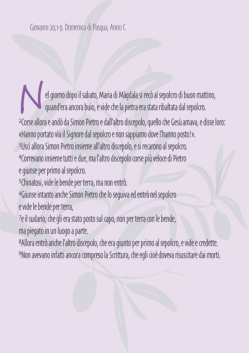Maria va alla tomba e vede la pietra ribaltata, corre a chiamare Pietro e l’altro discepolo, quello amato da Gesù, i due corrono, il secondo arriva per primo e vede le fasce; sopraggiunge Pietro, entra nel sepolcro e nota fasce e sudario ripiegato. A questo punto anche l’altro discepolo entra nel sepolcro, vede e crede.