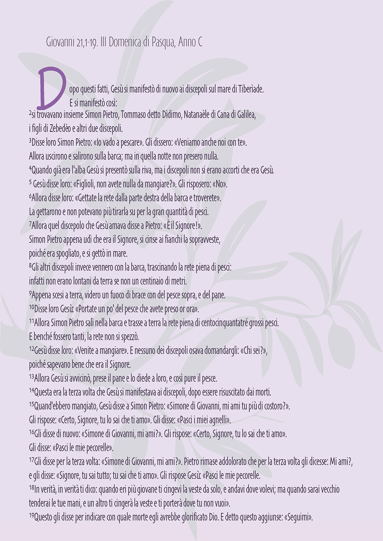 La pesca miracolosa è un evento posteriore alla risurrezione. La memoria torna all’altra pesca miracolosa narrata in Lc 5: ne emerge una continuità tra la manifestazione del Gesù terreno e quella del Gesù Risorto.
