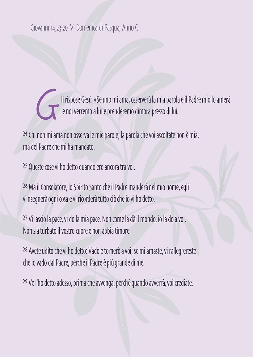 Lo Spirito Santo non sarà solo un difensore per i discepoli, sarà anche un maestro, insegnerà. E non sarà mai un insegnamento scollegato dall’esperienza che quei discepoli stanno vivendo. Lo Spirito Santo non agisce magicamente: ci ricorda la Parola e ce la fa comprendere nel quotidiano della nostra esperienza, svela le connessioni, il senso e indirizza l’agire.