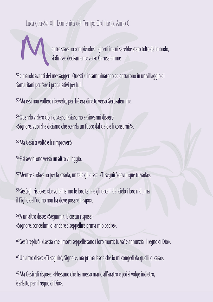 Le volpi hanno le loro tane e gli uccelli il loro nido e il Figlio dell’uomo non ha dove posare il capo… “Seguimi!” – “Permettimi prima…”; storie di persone, storia nostra, storia di tre aspiranti: Gesù va di villaggio in villaggio e alcuni stanno pensando di seguirlo. Il primo dice: “Ti seguirò ovunque tu vada!”. Entusiasmo da fuoco e fiamme, ma la risposta di Gesù è sbalorditiva: non ho una casa, dormo sotto le stelle, in un granaio, a volte in una casa se sono invitato. Sono un nomade. Gli animali hanno un nido, una tana, un rifugio. Io non ho niente per me. Se vuoi venire, aspettati una vita senza protezione materiale. Sei pronto? Lui è pronto a tutto… è un innamorato!