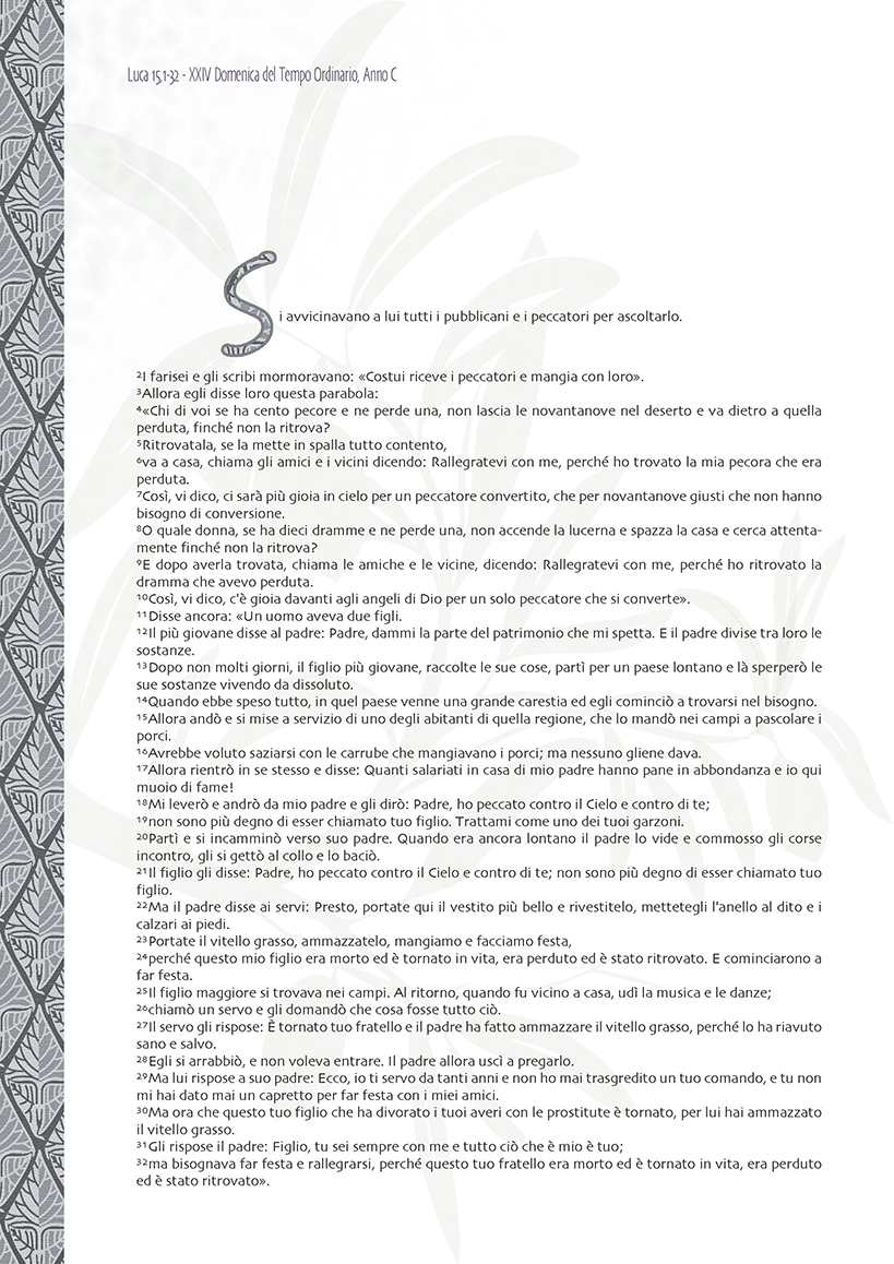 Nel Vangelo di questa domenica vengono proposti tre racconti che in genere vengono chiamati “la parabola della pecora smarrita”, “la parabola della dracma perduta” e la “parabola del figliuol prodigo”. Alcune traduzioni della Bibbia li presentano da un’altra prospettiva e li considerano insieme, chiamandoli “la parabola della gioia del Padre”. In effetti, il testo non annuncia una serie di parabole, ma una sola articolata su tre livelli, corrispondenti ai tre racconti; in un crescendo di senso il lettore è obbligato a notare la differenza tra i vari tipi di rapporto che gli esseri umani possono instaurare nel mondo, fino ad arrivare alla genitorialità, alla figliolanza, alla fraternità. Sono tre dimensione che si evolvono dall’utilitarismo, all’altruismo, alla gioia per il ritorno alla vita.