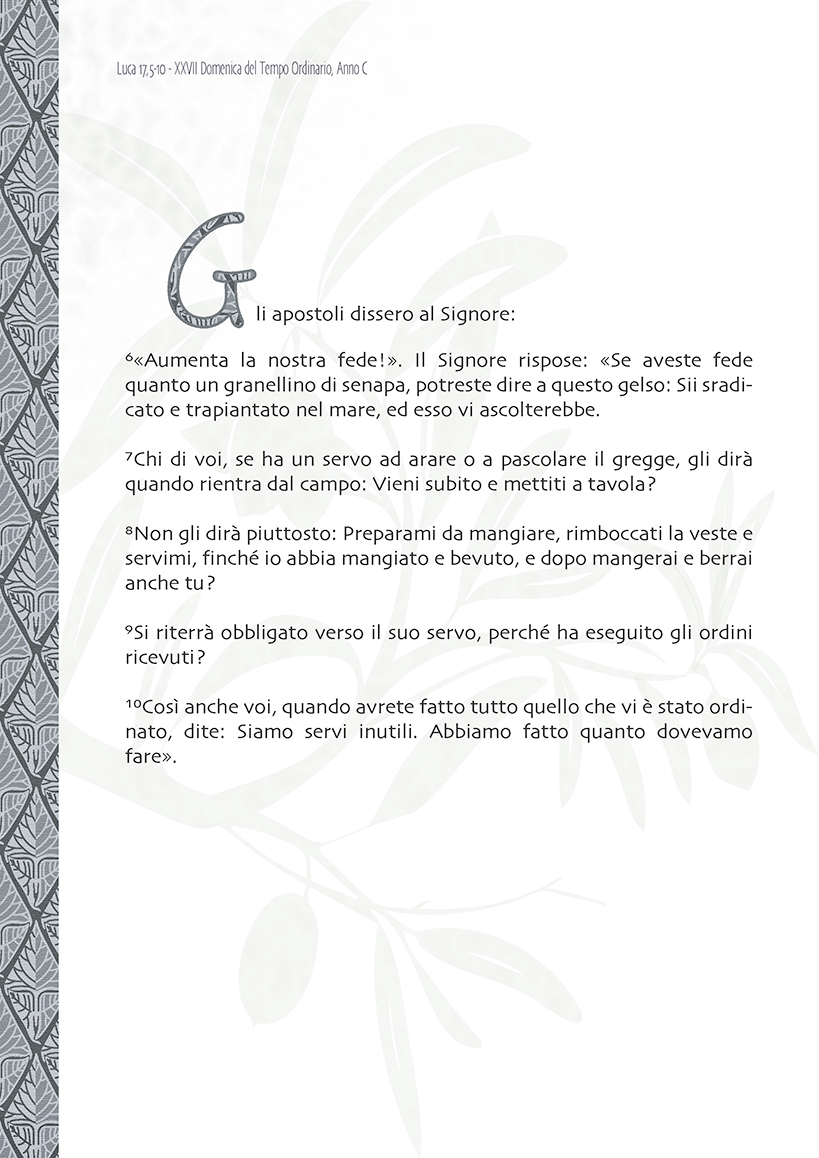 Purtroppo il testo liturgico non fornisce il contesto della richiesta. In precedenza Gesù aveva detto: “E se sette volte al giorno pecca contro di te e sette volte torna da te dicendo: ‘Mi pento’, tu lo perdonerai”. Significa avere…un cuore grande come una capanna… poi anche la speranza che noi stessi e gli altri possiamo cambiare in meglio perché la vita è molto più grande di ciò che vediamo.