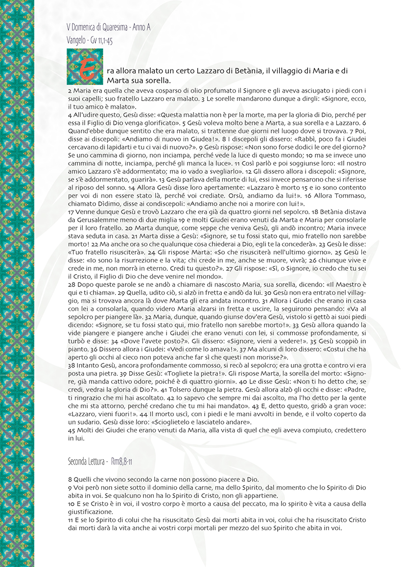 I discepoli – come Marta, Maria e gli altri – restano con Gesù, non se la prendono con lui perché Lazzaro è morto, piuttosto sono persuasi di camminare, come lui e con lui, anche loro verso la propria morte. La morte di Lazzaro è dunque prefigurazione non solo di quella di Gesù, ma anche della nostra, un evento necessario per poter risorgere. Il Vangelo, la Parola di Dio si chiude con la resurrezione.