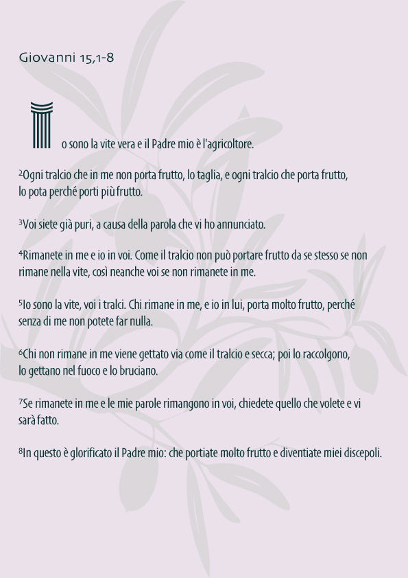 La vite, quanto il gregge la scorsa domenica, ci avvicinano alla Scrittura e al contesto agricolo-pastorale nel quale accadono i fatti narrati; il testo è parte di un lungo discorso iniziato al capitolo 13 (dopo l’Ultima Cena) che termina al capitolo 17 con la preghiera sacerdotale e ha il suo culmine nel comando lasciato al versetto 17 del capitolo 15: “Questo vi comando: che vi amiate gli uni gli altri”, la parola di Gesù forse più nota.